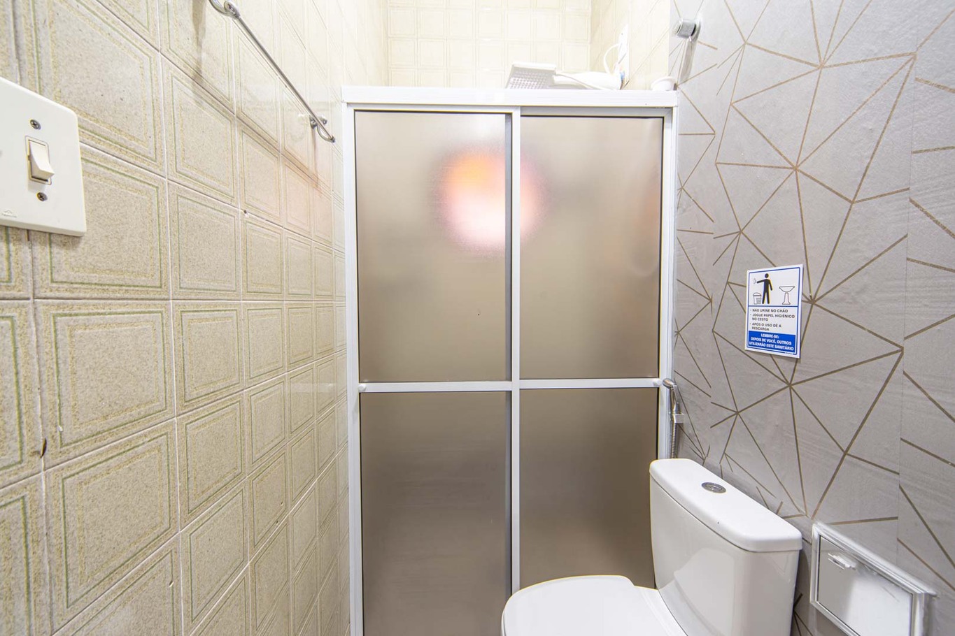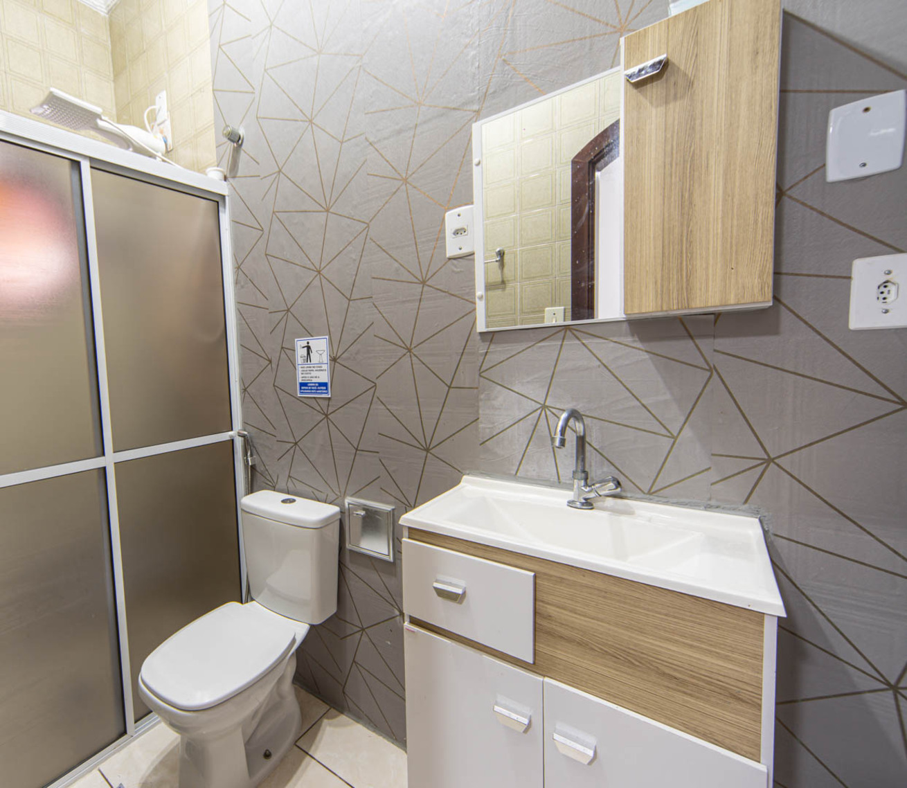 - Banheiro social com chuveiro elétrico e box de vidro/acrílico