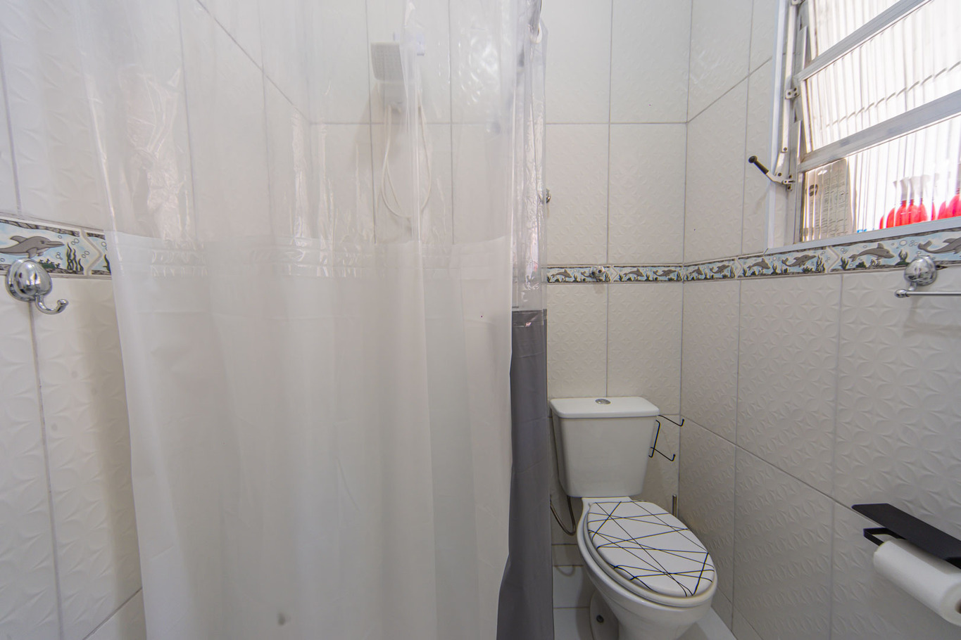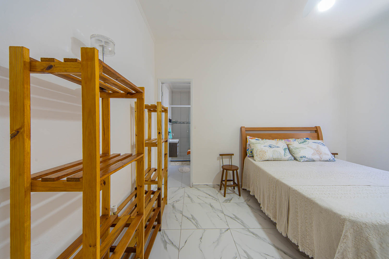 - Quarto 1 com cama de casal, armário, ventilador de teto e banheiro com box