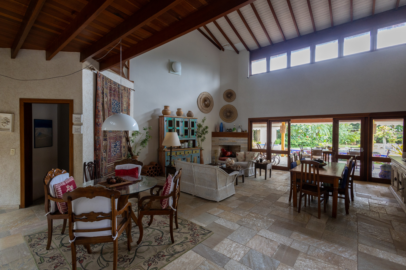 - Sala de estar ampla e climatizada, com lareira, TV, confortáveis sofás e duas mesas de jantar