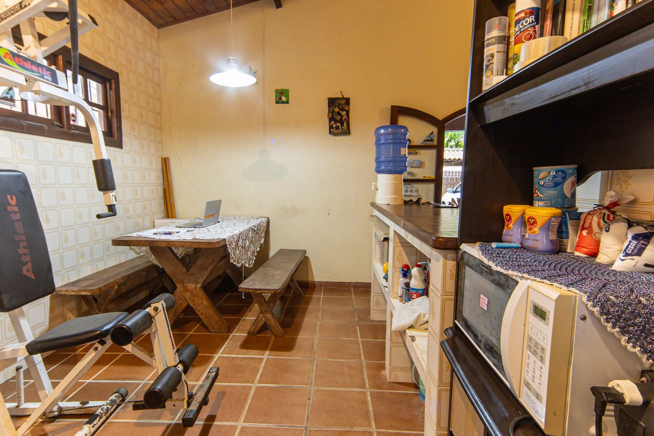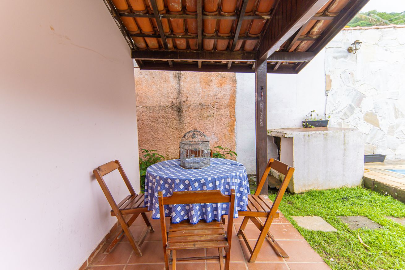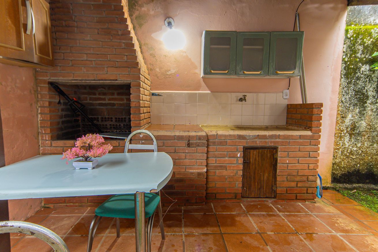 - Área gourmet equipada com churrasqueira, mesa, pia e armário com utensílios básicos de cozinha. A casa conta ainda com varanda com sofá desmontável (que se transforma em sala de estar), redes de descanso, guarda-sol, esteiras, espreguiçadeiras, cadeiras de praia, bicicleta infantil e brinquedos para crianças