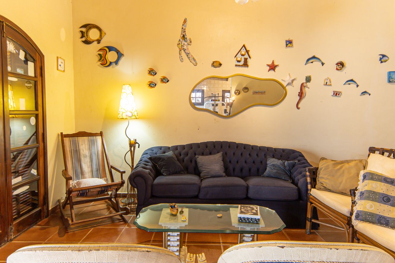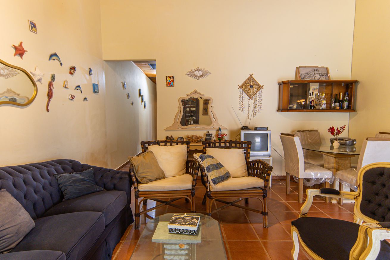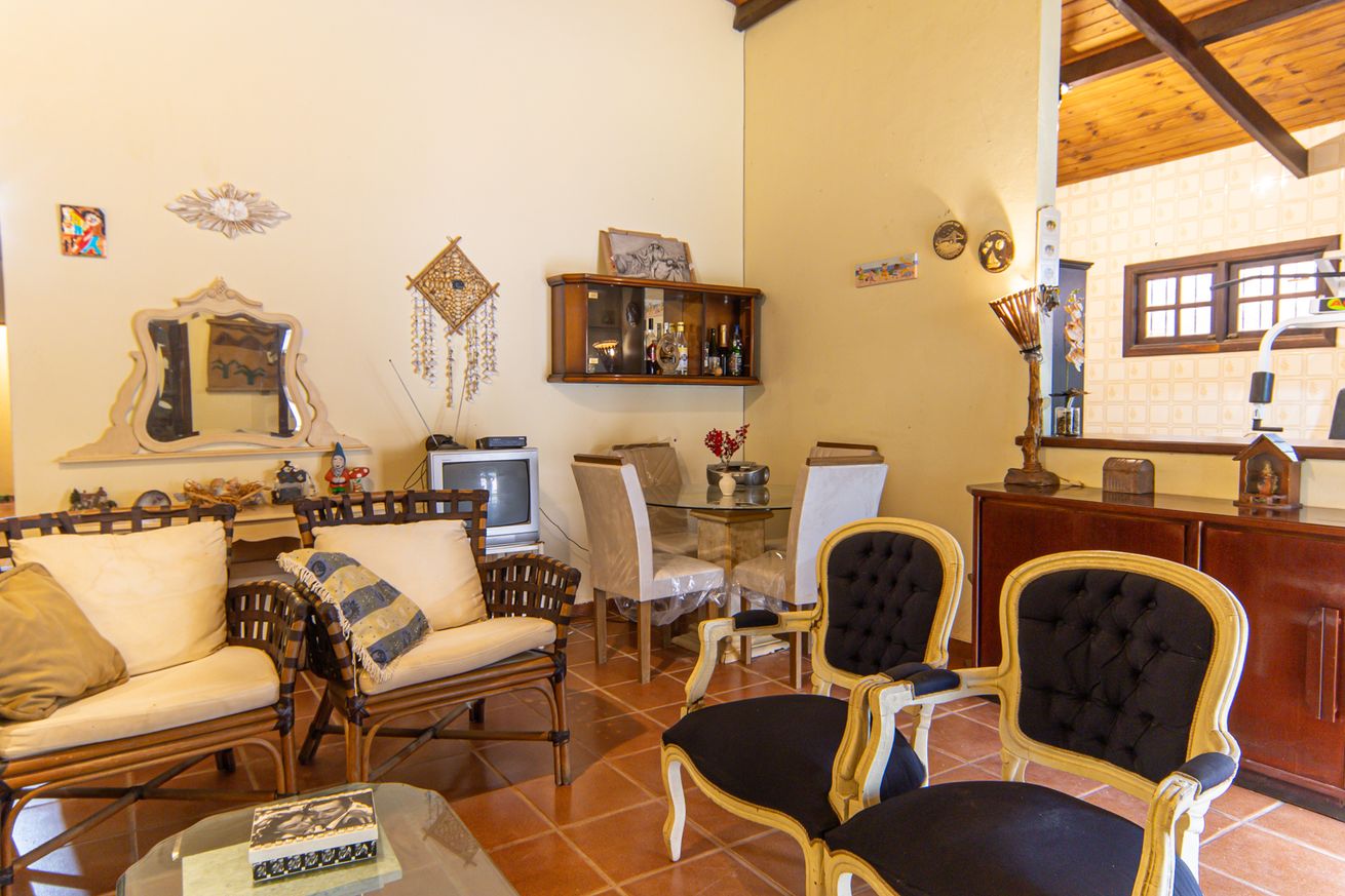 - Sala com sofá de 3 lugares, poltrona, cadeiras, banquetas, buffet e mesa para até 4 pessoas