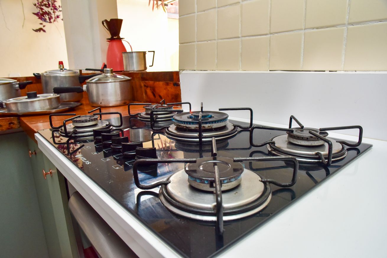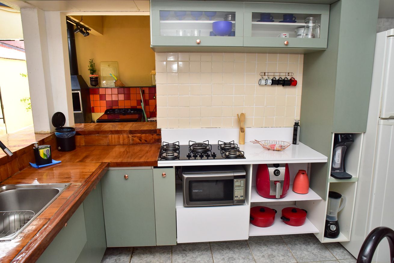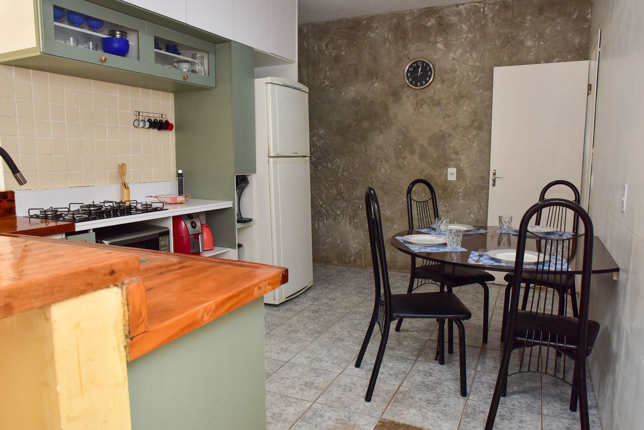 - Cozinha com fogão cooktop 5 bocas, fogão, geladeira, freezer, micro ondas, fritadeira, liquidificador, purificador de água, utensílios completos(exceto óleo e sal), balcão e mesa de jantar com 4 cadeiras