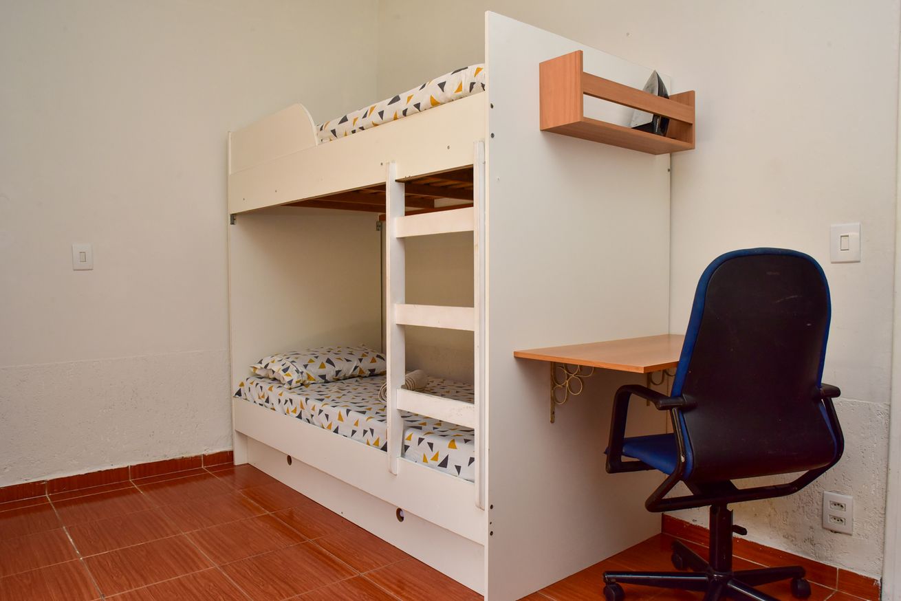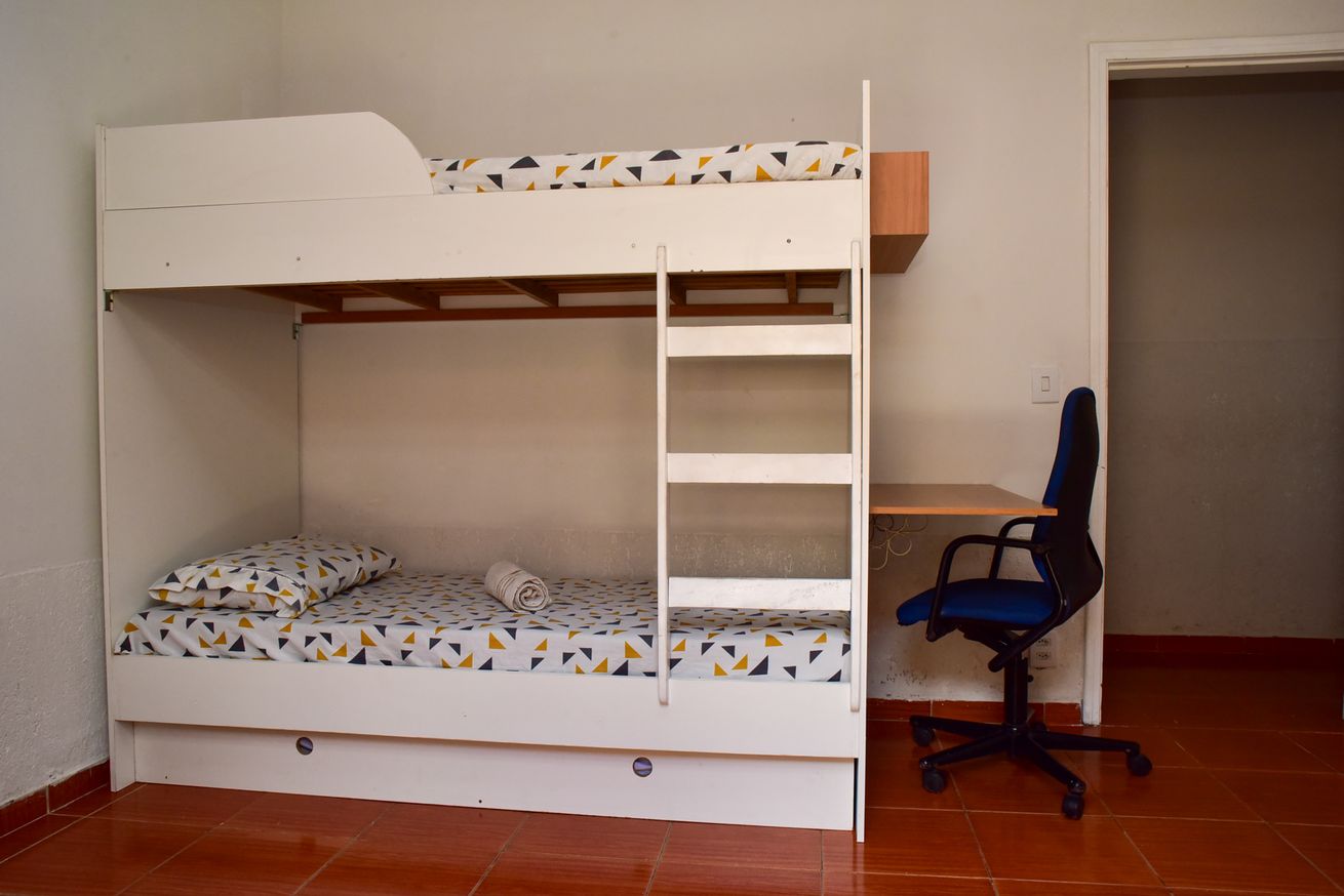 - Quarto 1: Beliche com cama auxiliar inferior, armário, protetor de colchão e mesa para trabalho ou estudo
