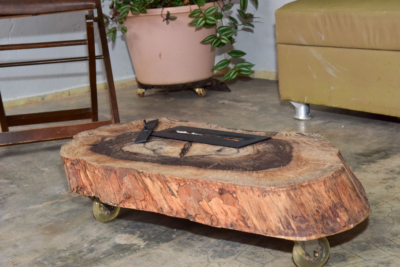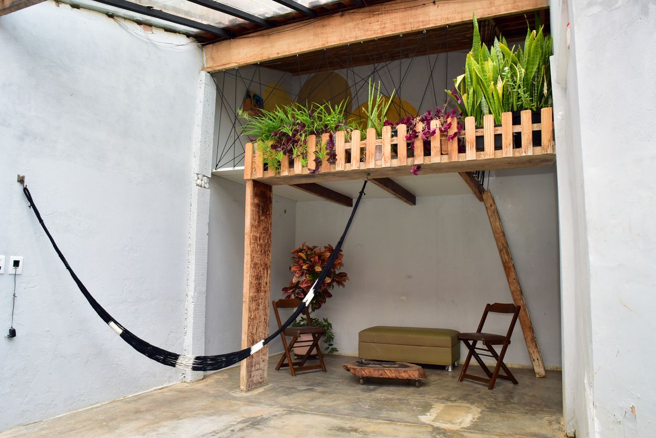 - Lareira ecológica externa com mezanino, puffs e cadeiras