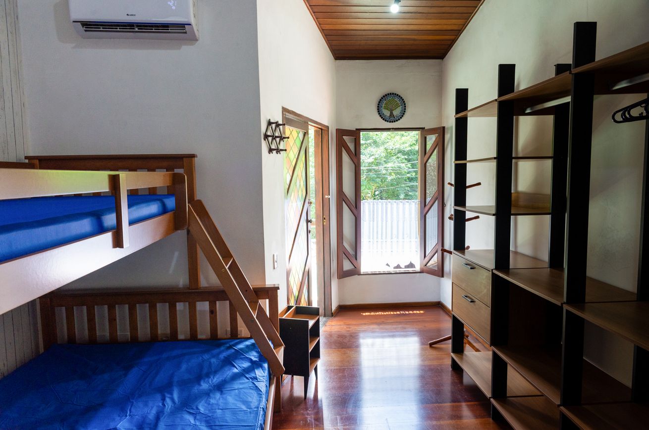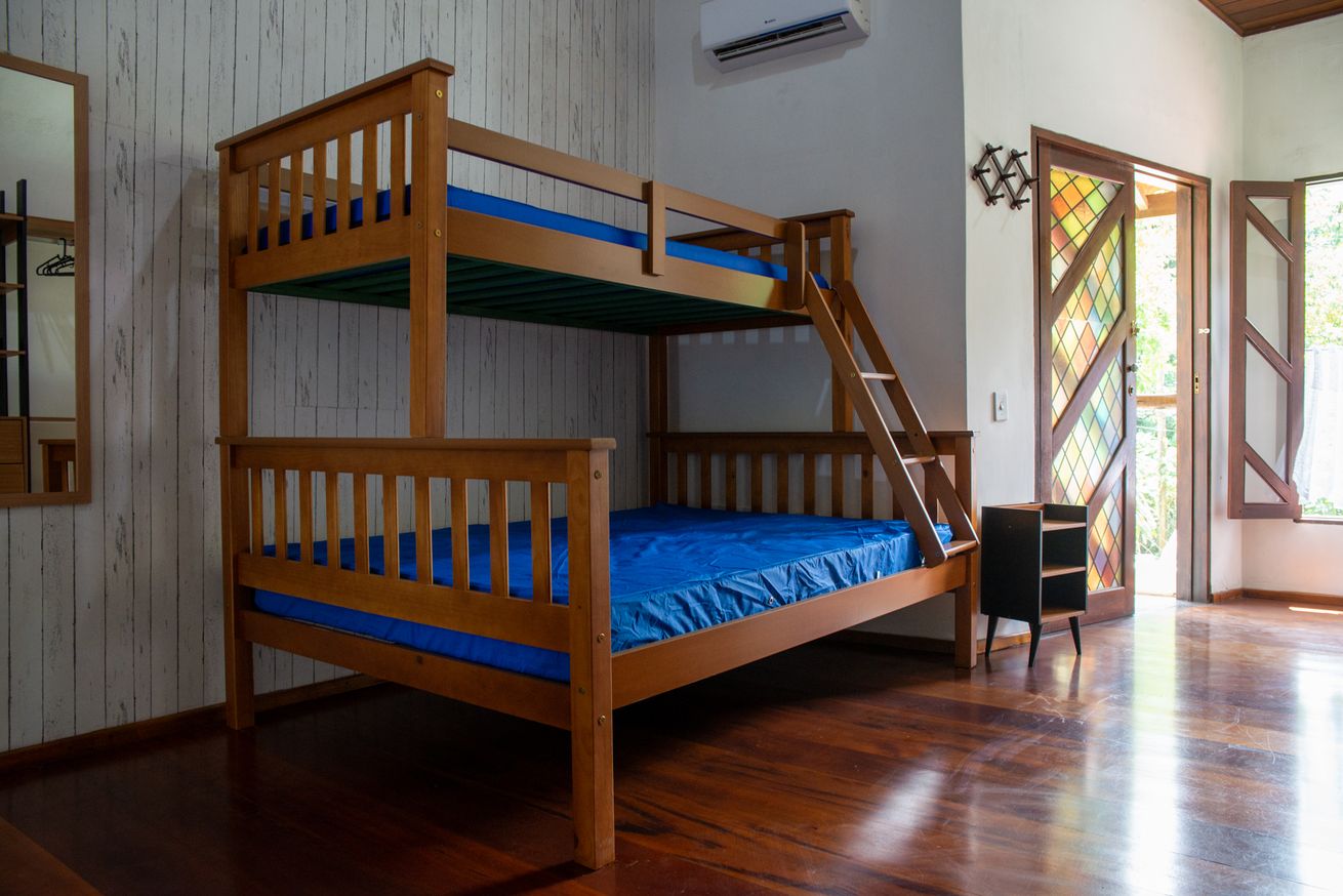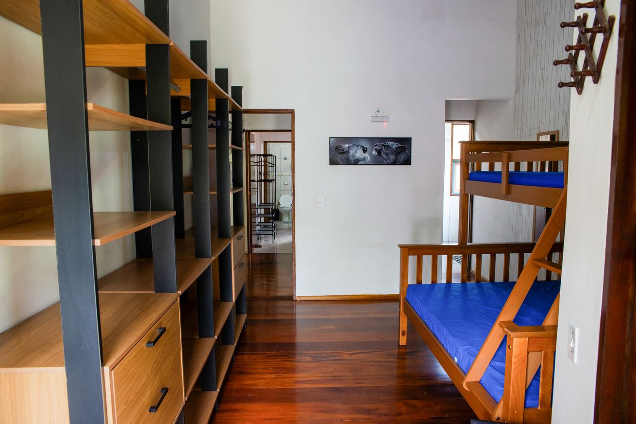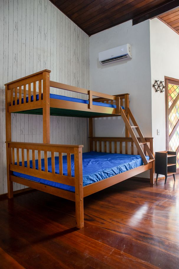 - Suíte 1 com 1 cama de casal (parte inferior do beliche), 1 cama de solteiro (parte superior do beliche), ar-condicionado, ventilador e banheiro com chuveiro elétrico, box e secador