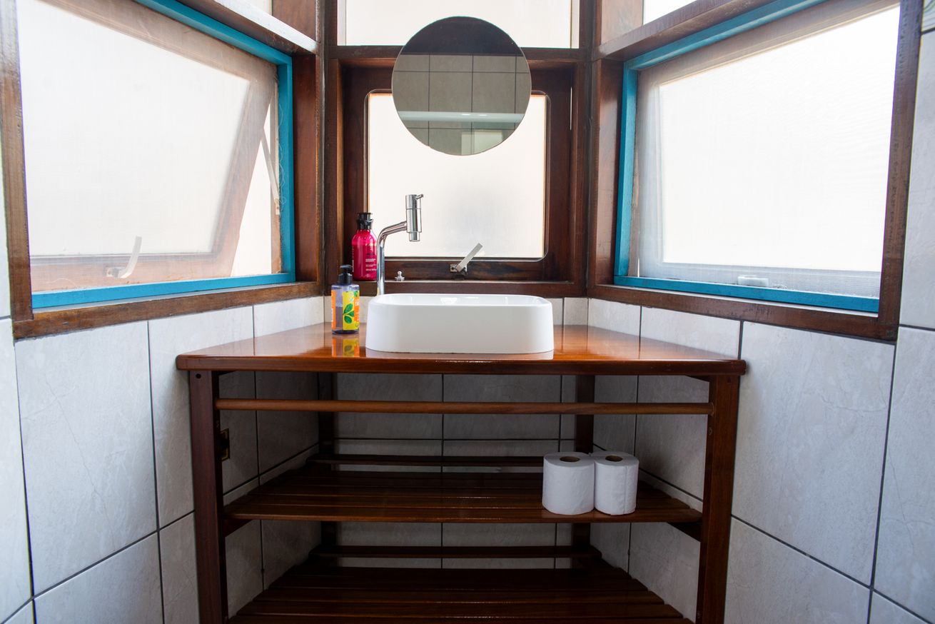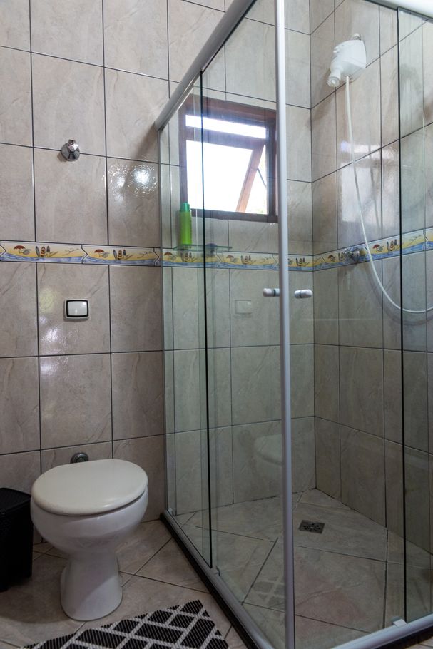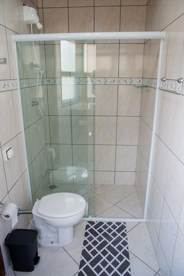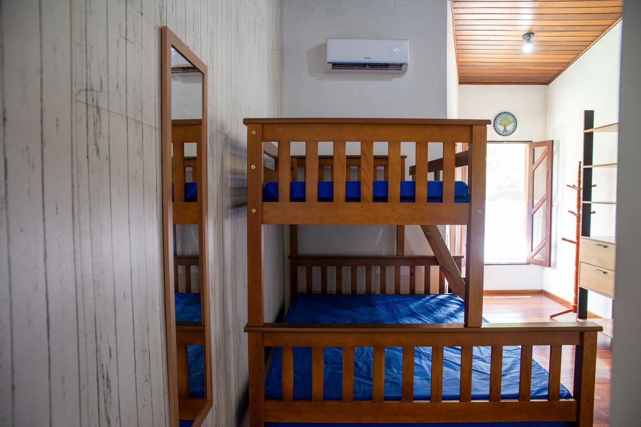 - Suíte 1 com 1 cama de casal (parte inferior do beliche), 1 cama de solteiro (parte superior do beliche), ar-condicionado, ventilador e banheiro com chuveiro elétrico, box e secador
