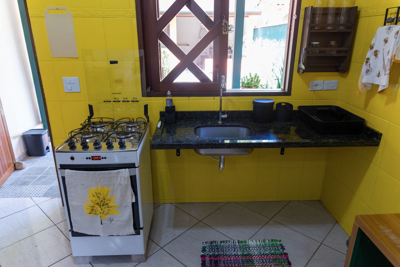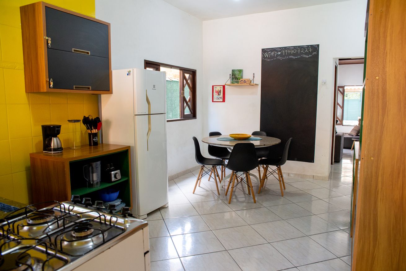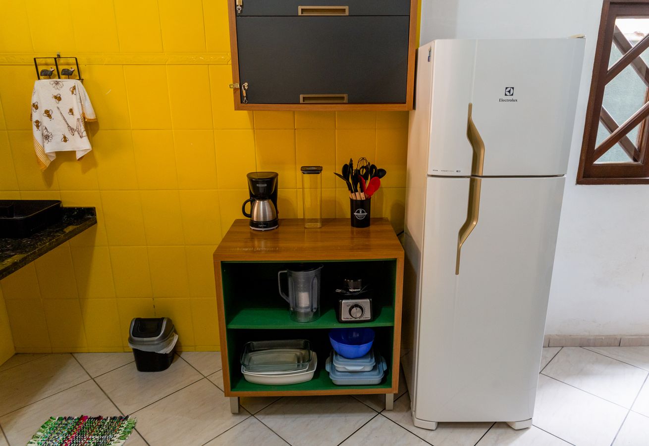 - Cozinha completa com fogão, forno, geladeira, microondas, cafeteira, liquidificador, purificador/filtro de água, utensílios e itens diversos(exceto óleo e sal)