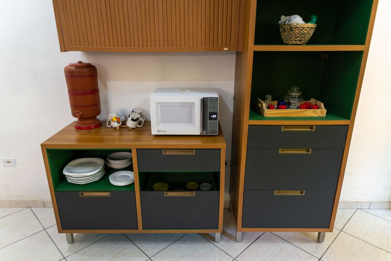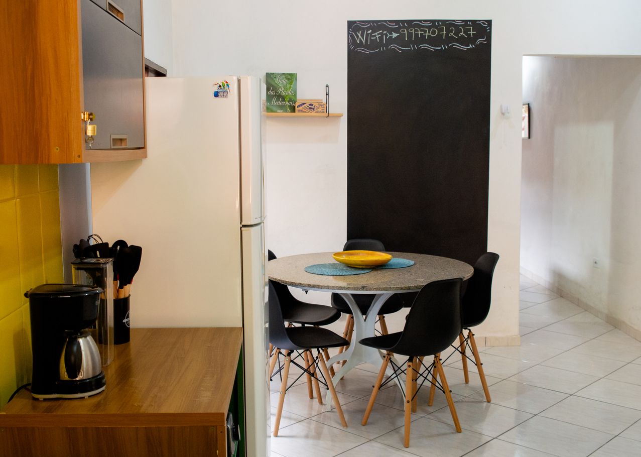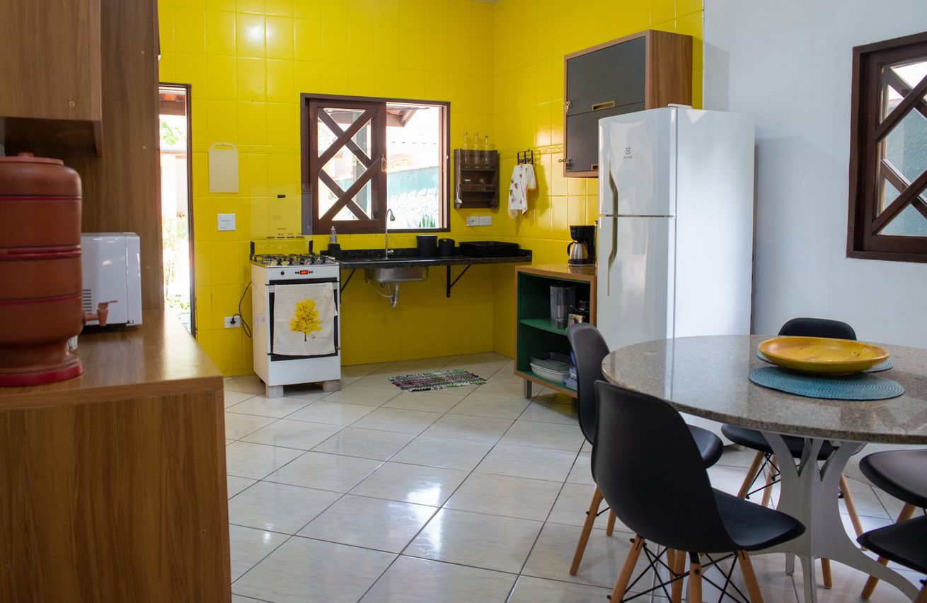 - Cozinha completa com fogão, forno, geladeira, microondas, cafeteira, liquidificador, purificador/filtro de água, utensílios e itens diversos(exceto óleo e sal)