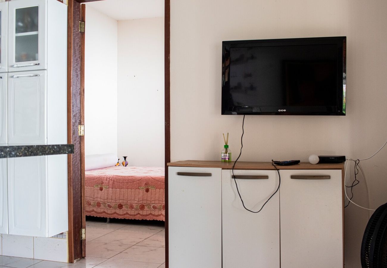 - A cozinha oferece freezer, fritadeira, fogão, forno elétrico, geladeira, liquidificador, micro-ondas, purificador de água e batedeira