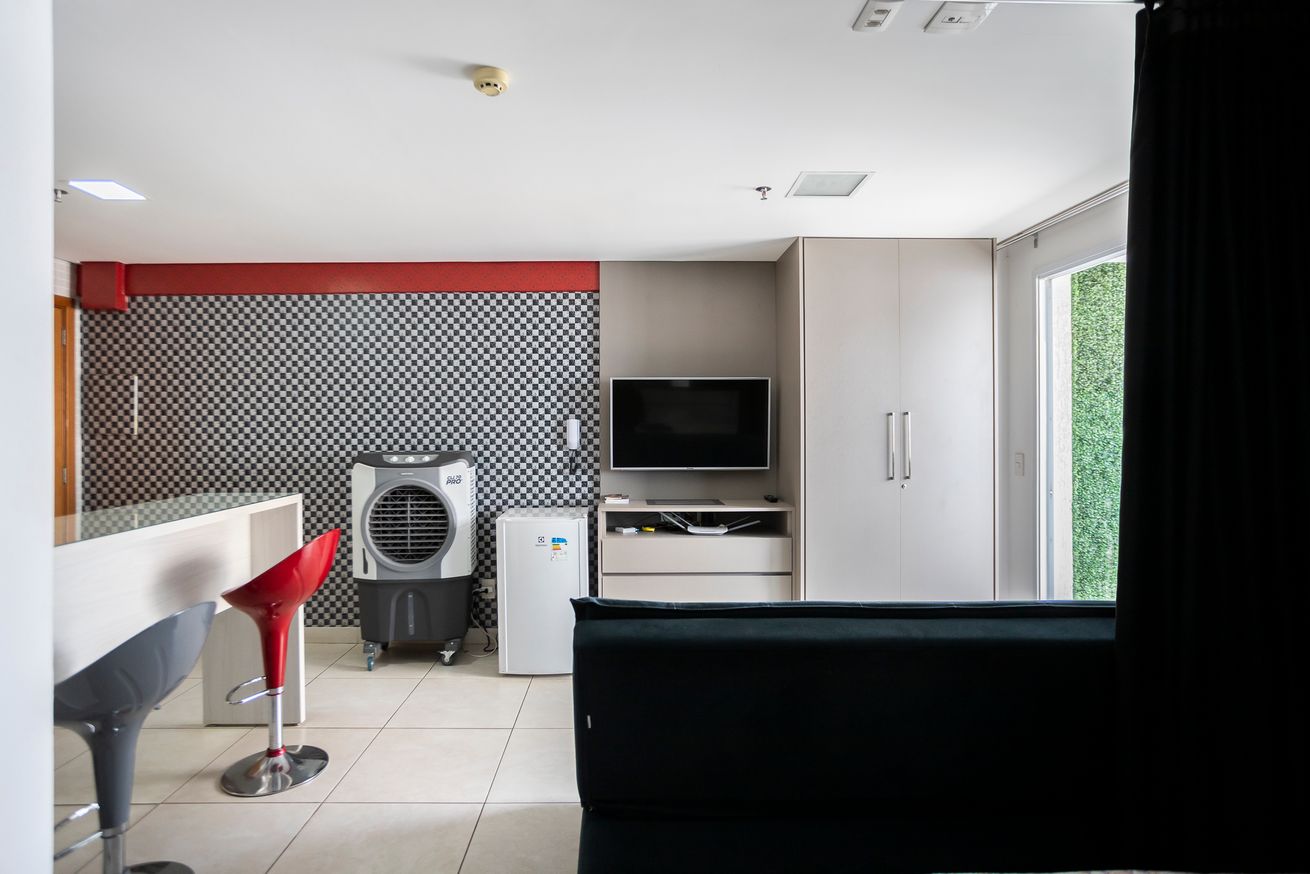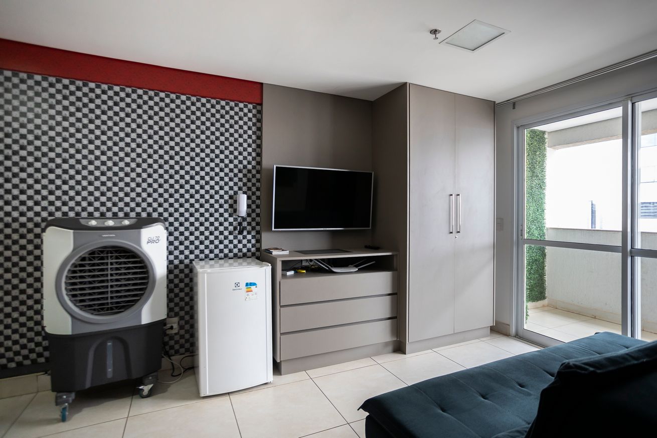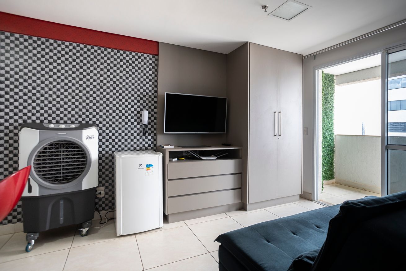 - Sala sofá-cama, smart TV, climatizador e integração com varanda.