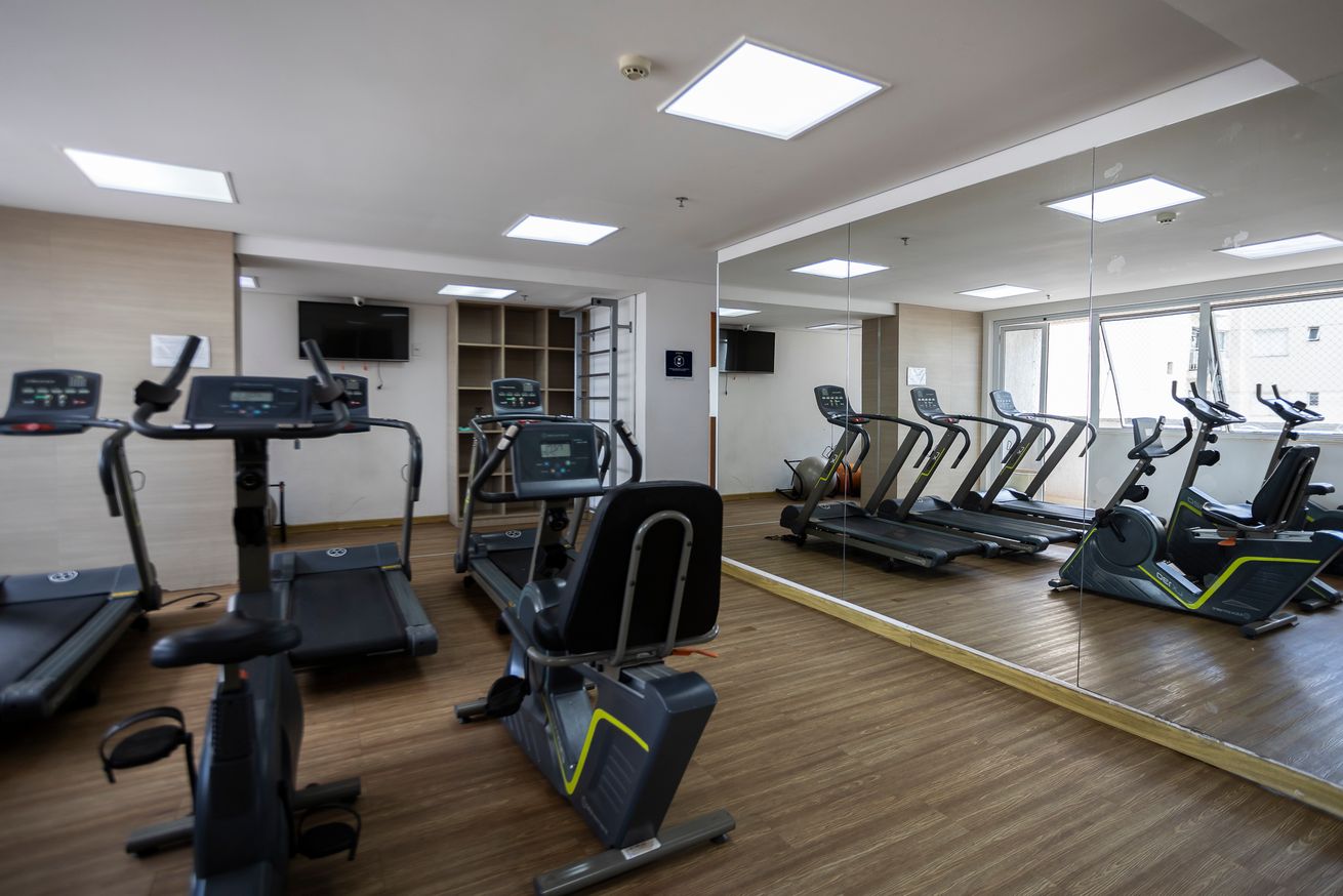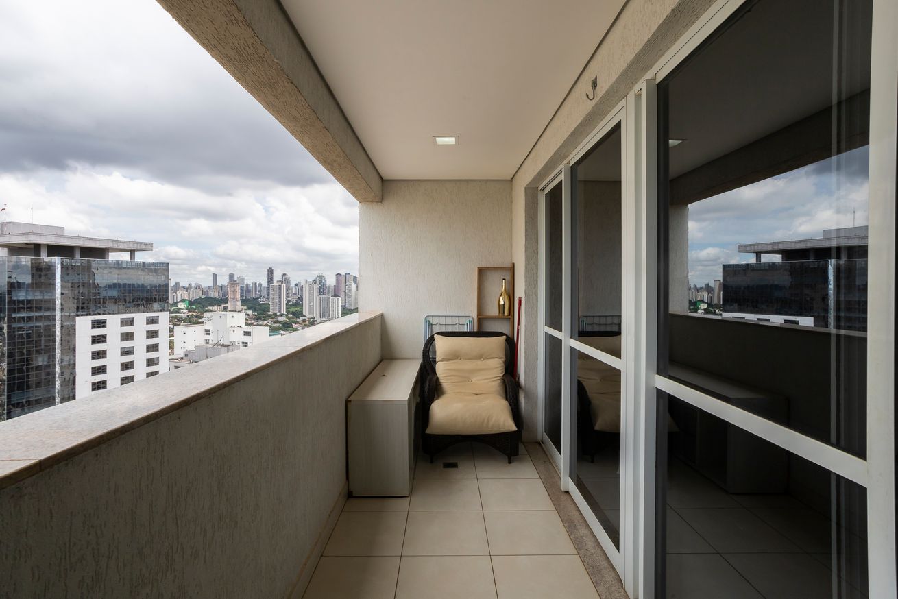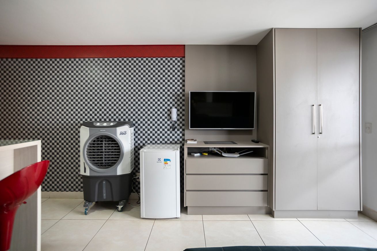 - Sala sofá-cama, smart TV, climatizador e integração com varanda.