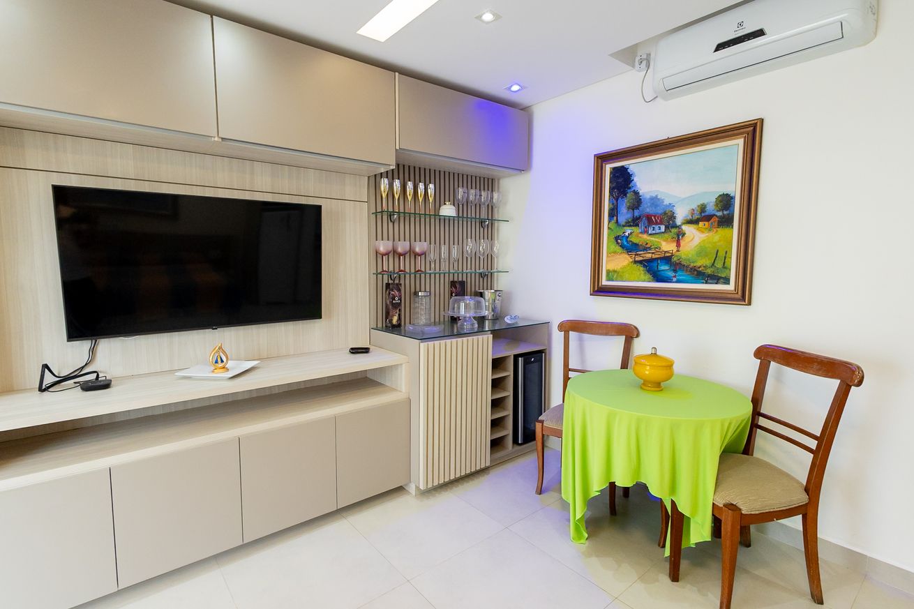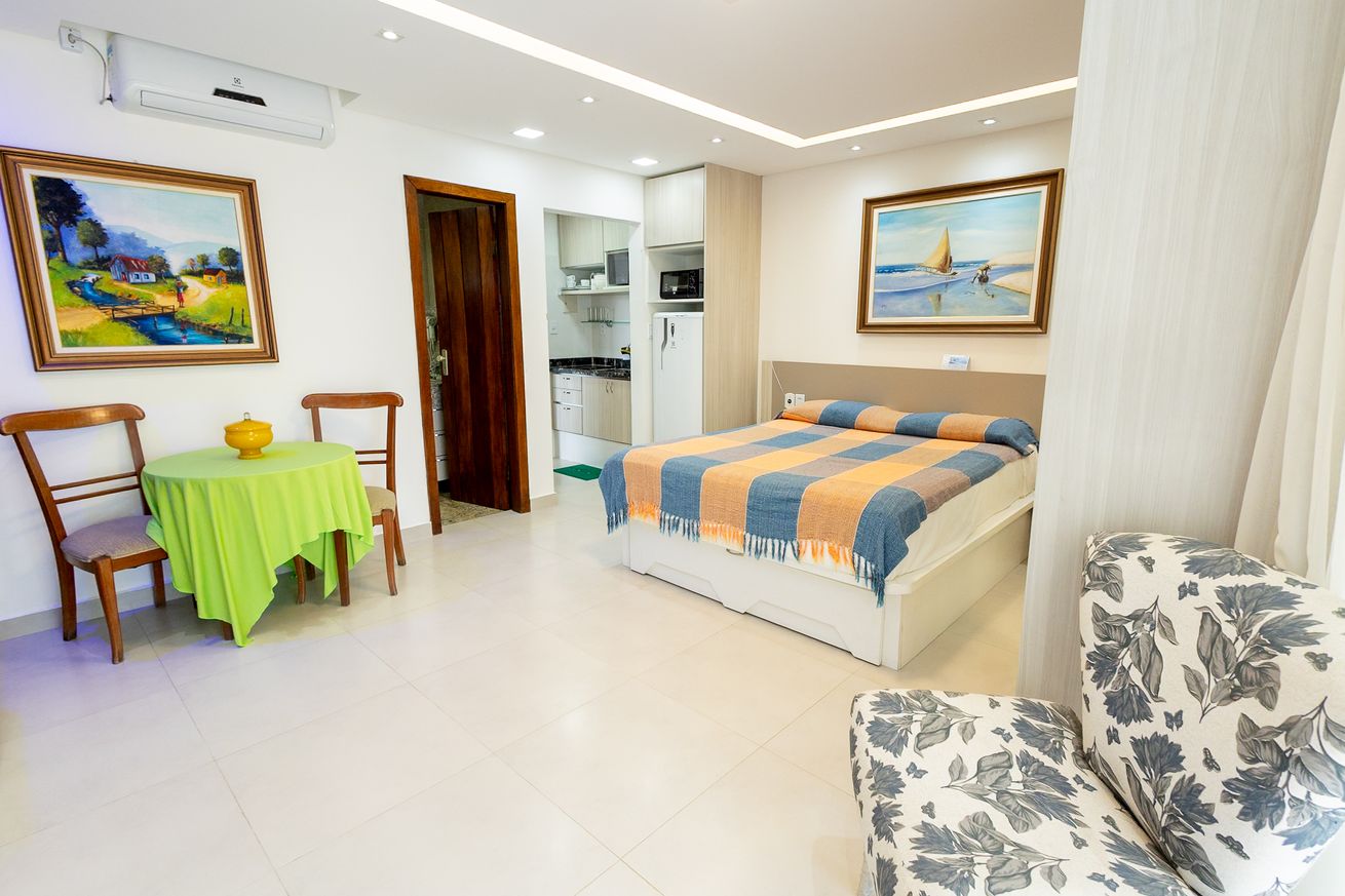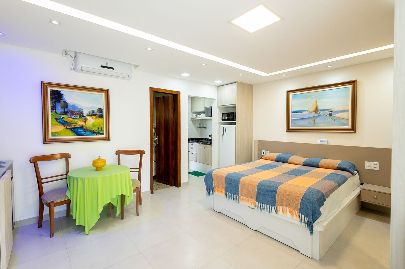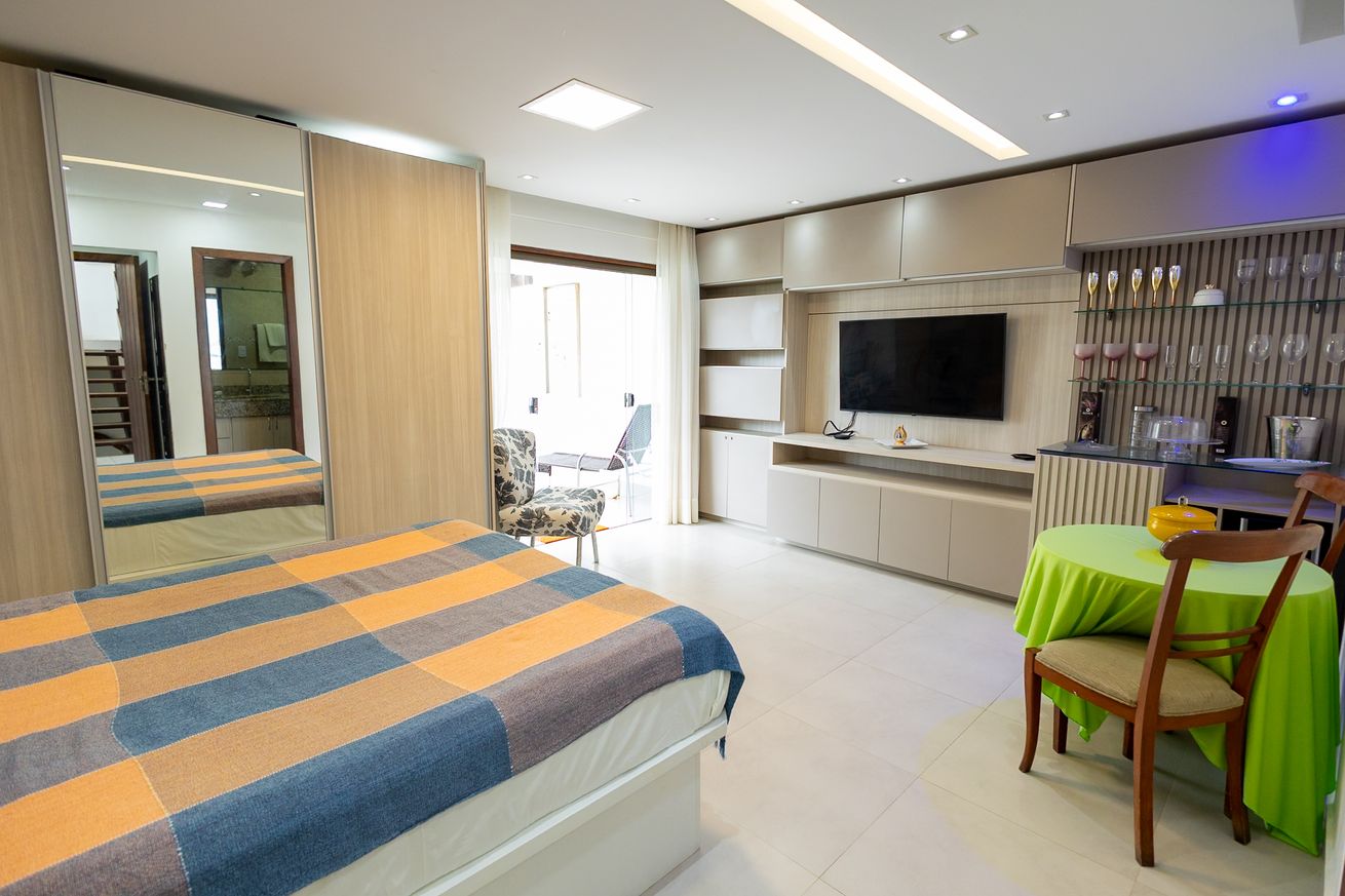 - Quarto confortável com cama de casal, smart TV, armário amplo com divisões, mesa e cadeira