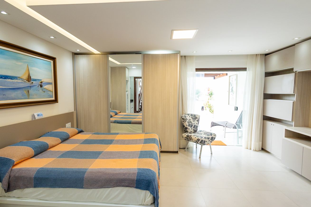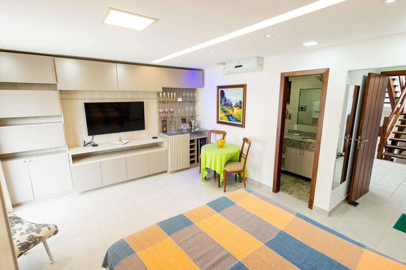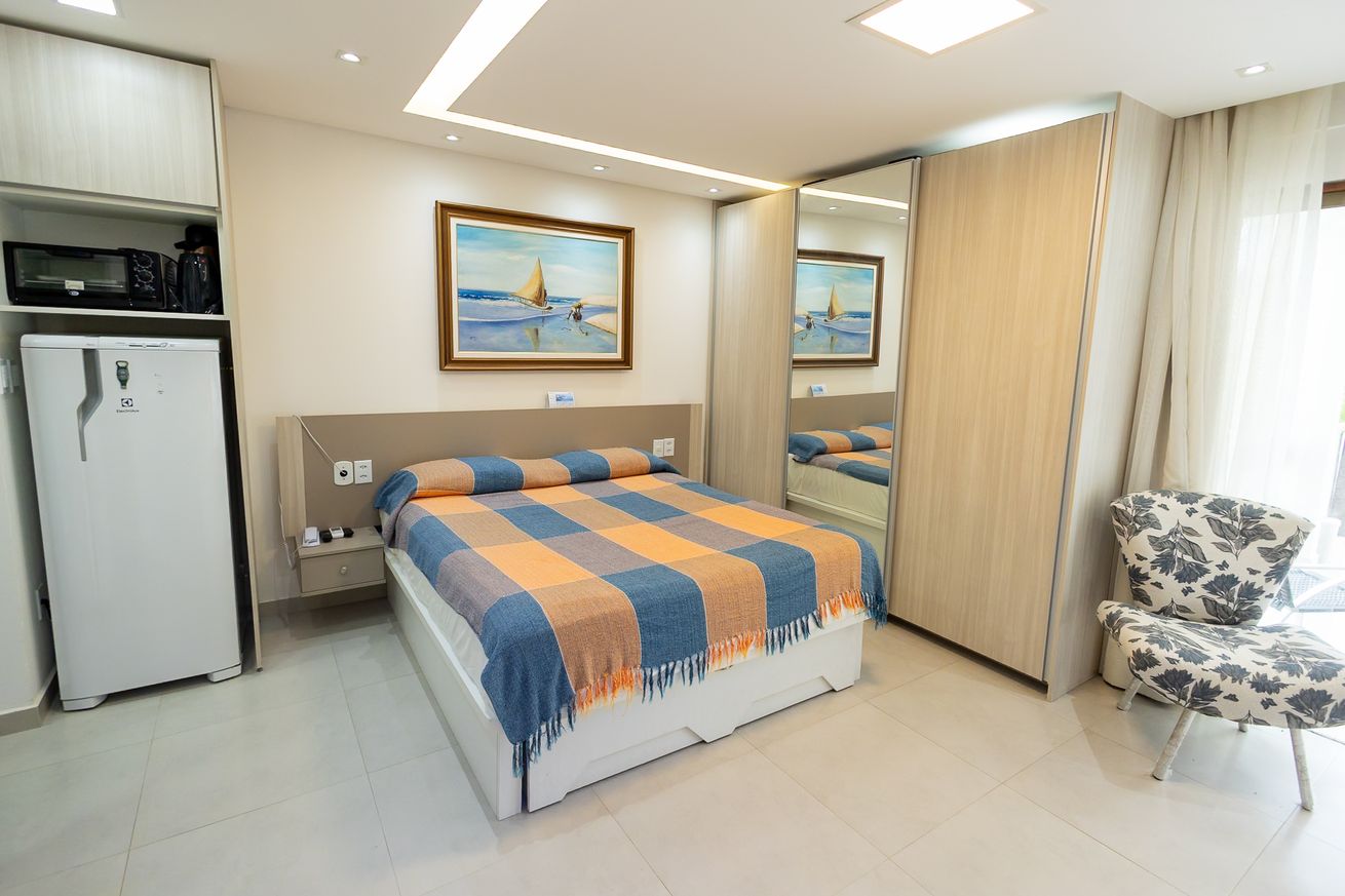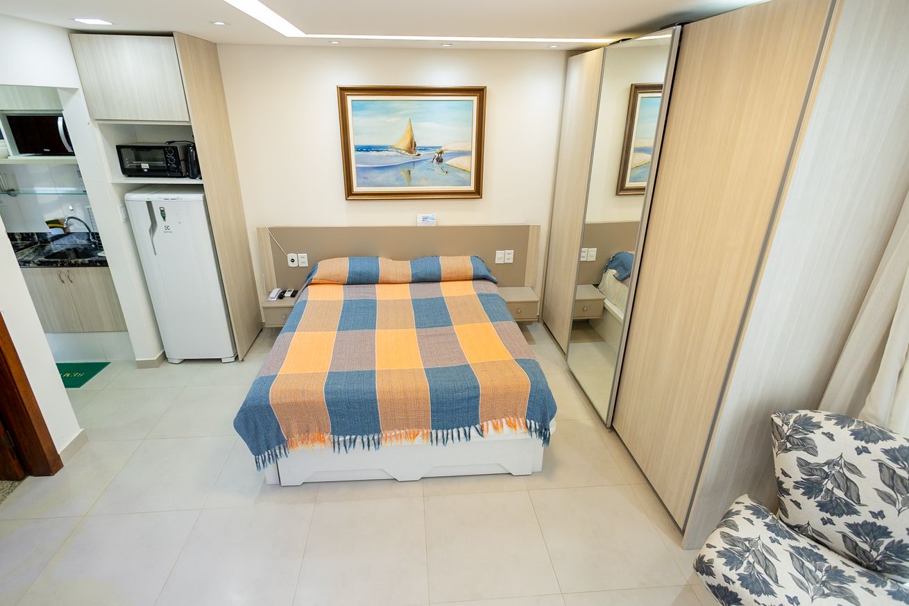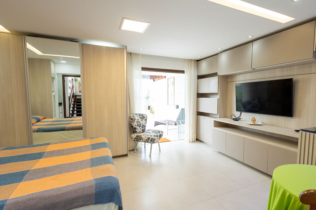- Quarto confortável com cama de casal, smart TV, armário amplo com divisões, mesa e cadeira