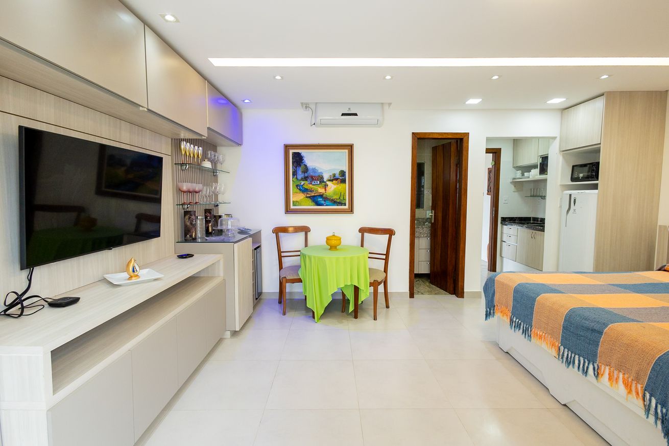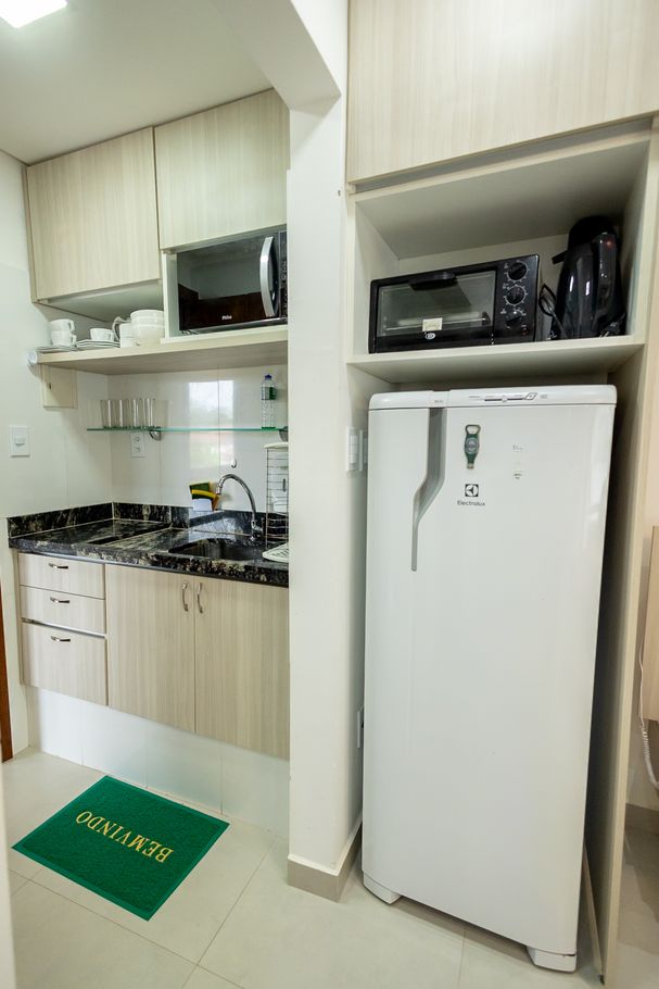 - Cozinha em ambiente integrado equipada e funcional com geladeira, fogão, forno, micro-ondas, cafeteira, utensílios e itens completos(exceto óleo e sal)