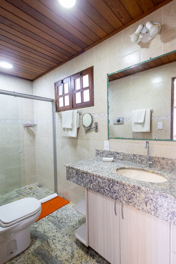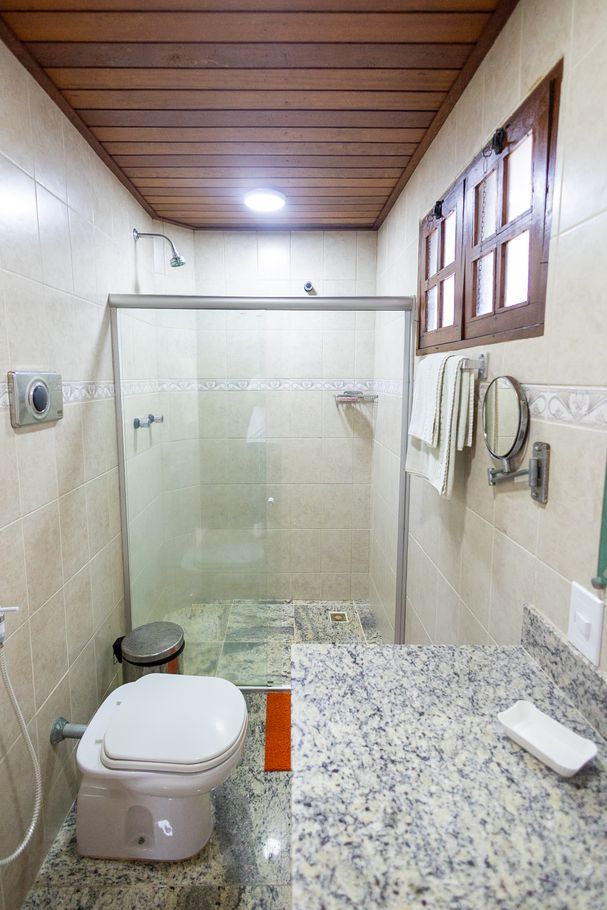 - Banheiro completo com chuveiro elétrico, box de vidro e secador de cabelo