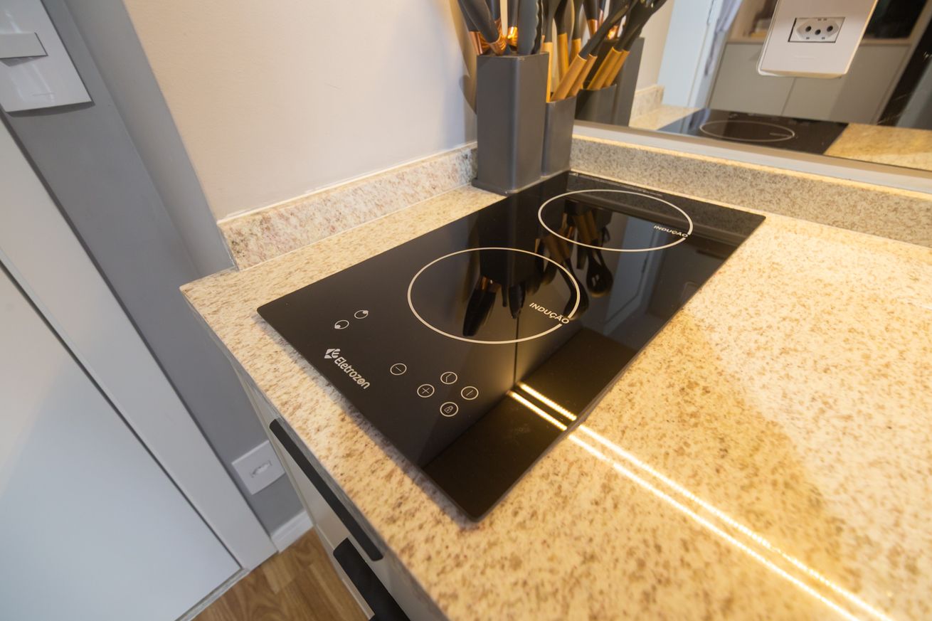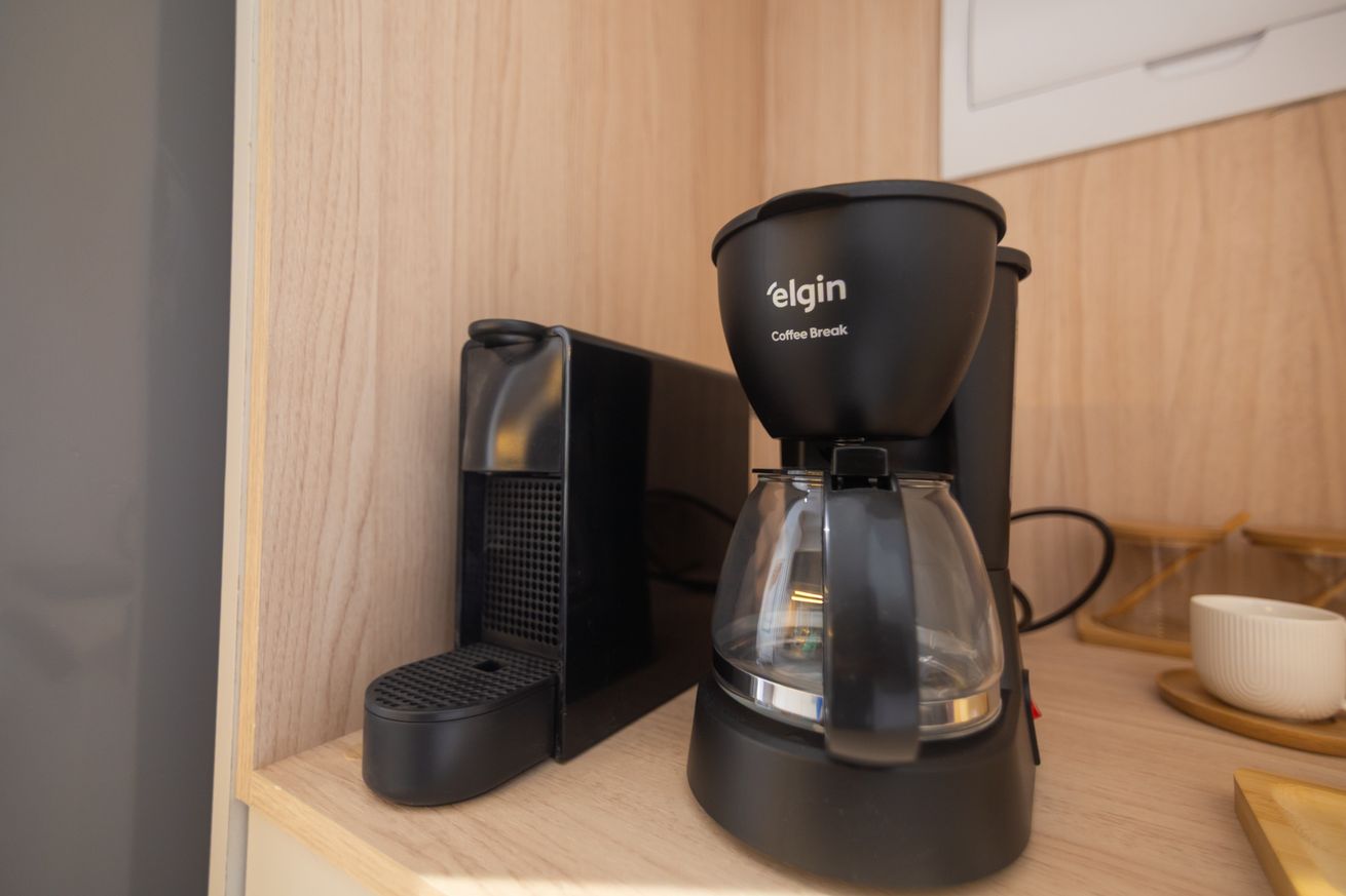 - Cozinha equipada com cooktop, geladeira, microondas, cafeteira, máquina de expresso, airfryer e utensílios diversos(exceto óleo e sal). Mesa com 2 cadeiras para refeições.