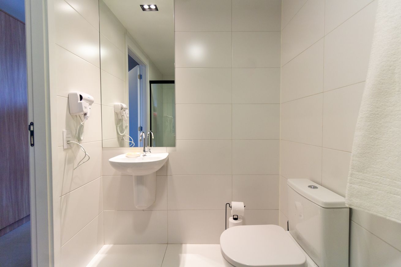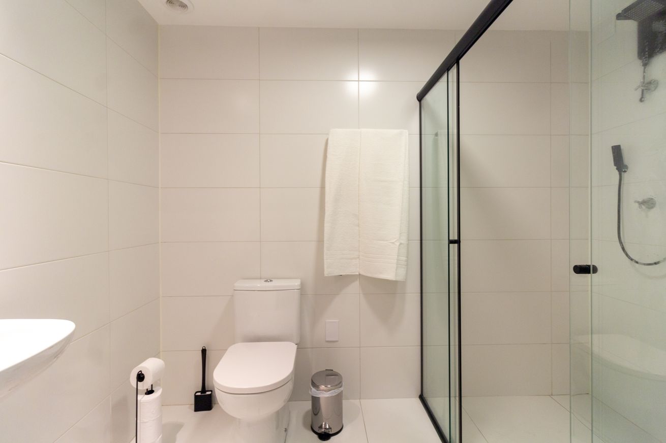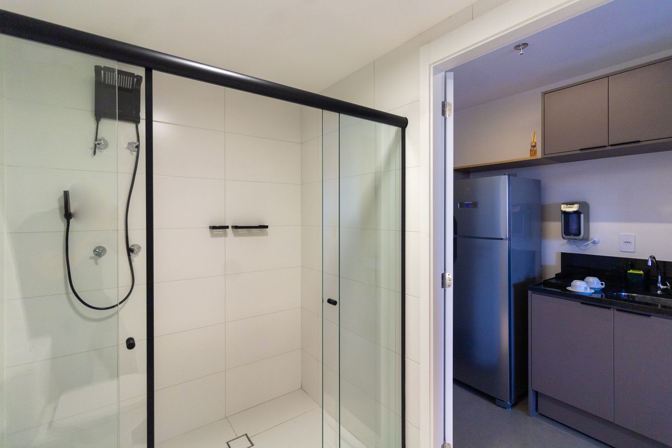 - Banheiro com chuveiro elétrico, box de vidro e secador de cabelo