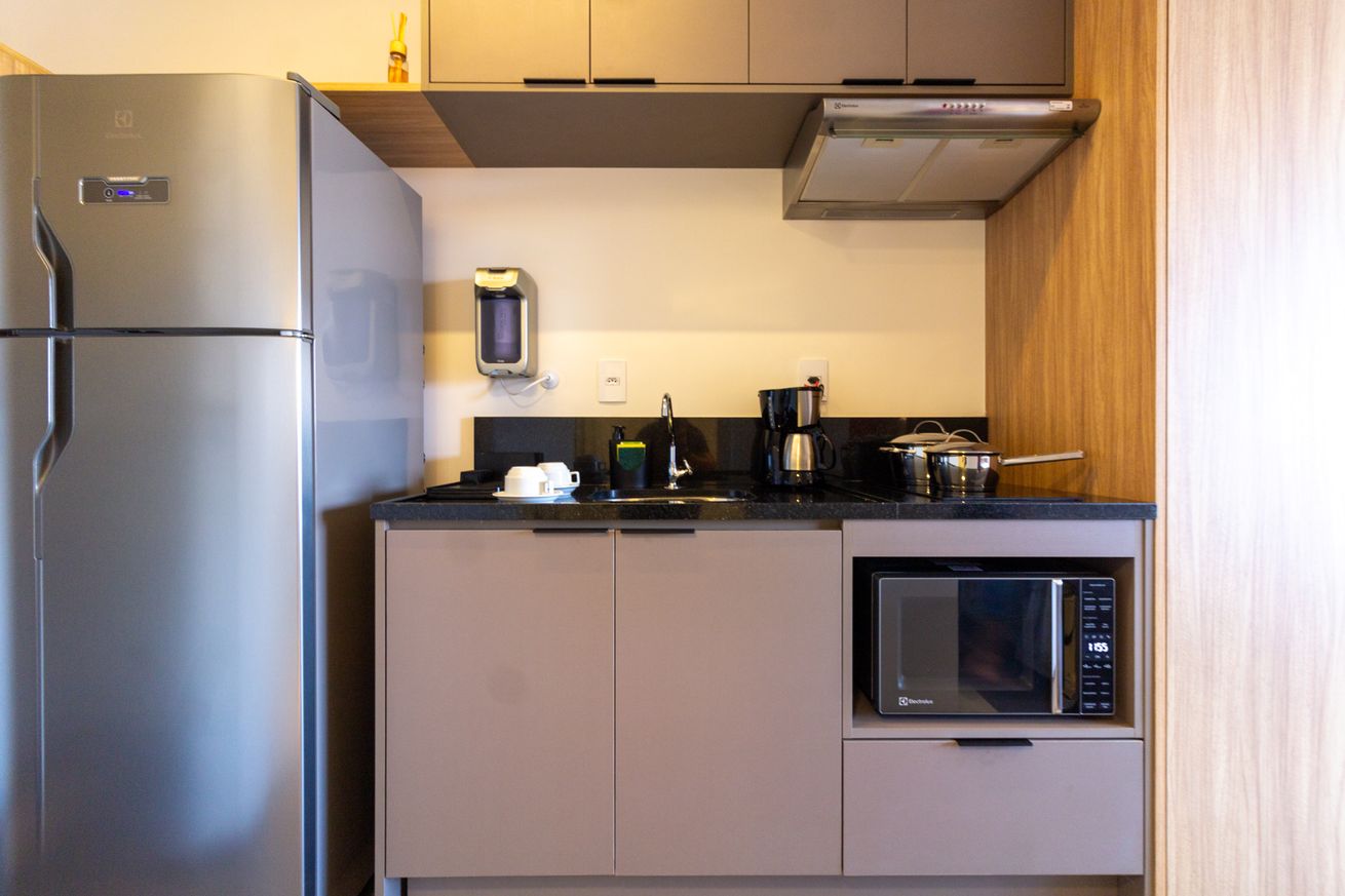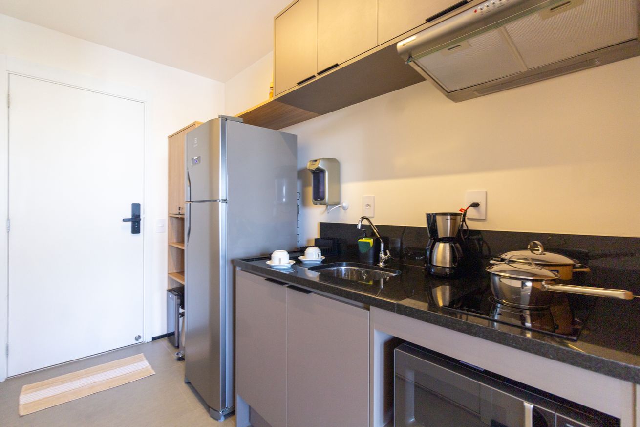 - Cozinha com cooktop, geladeira, freezer, microondas, cafeteira, liquidificador, utensílios e itens básicos(exceto óleo e sal)