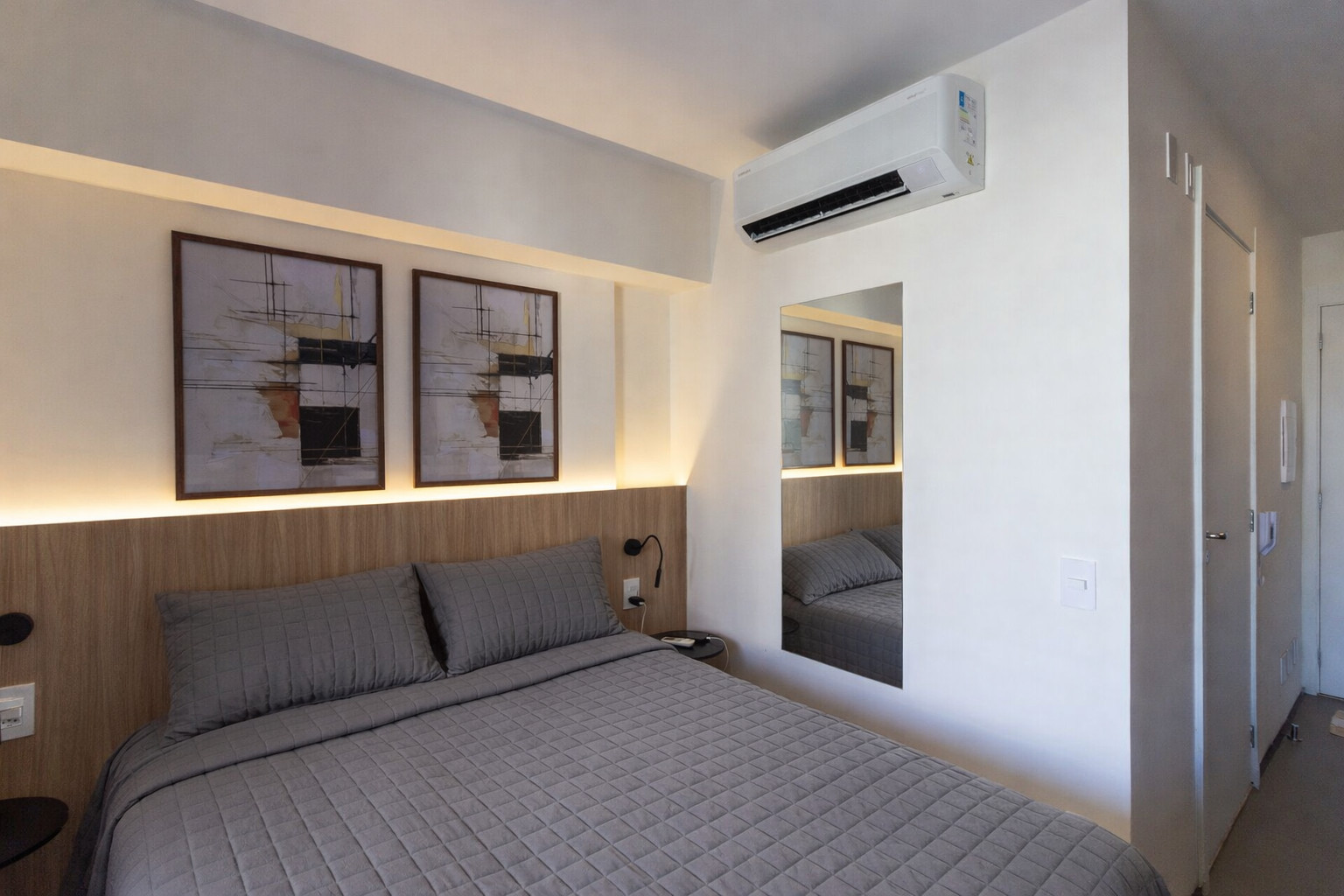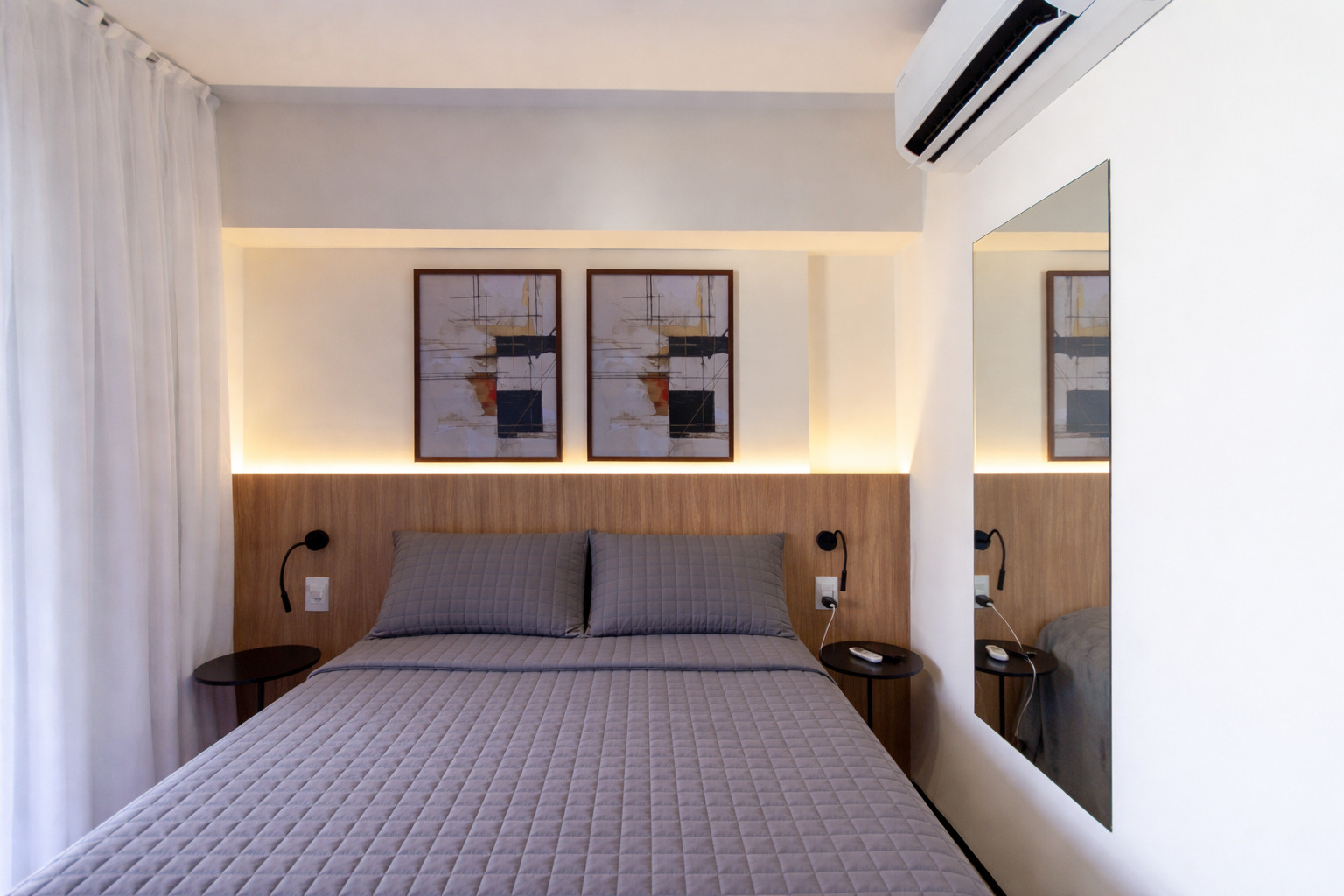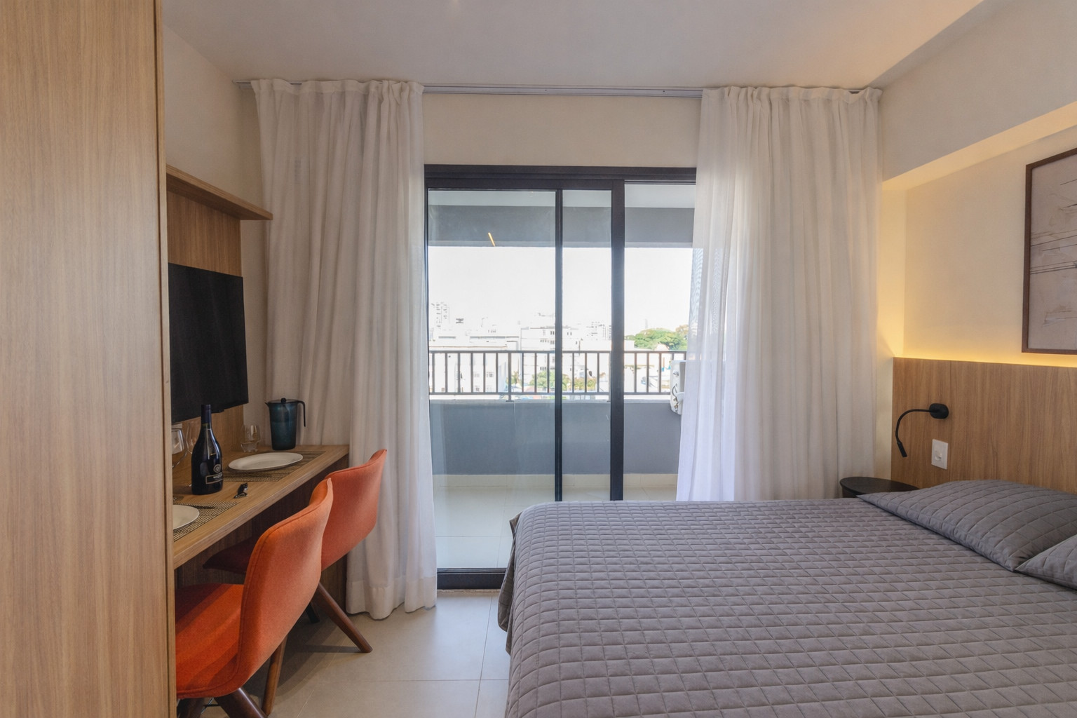 - Ambiente integrado com 1 cama de casal, ar-condicionado, smart TV, sofá, mesa multifuncional para refeições e trabalho; e varanda ampla