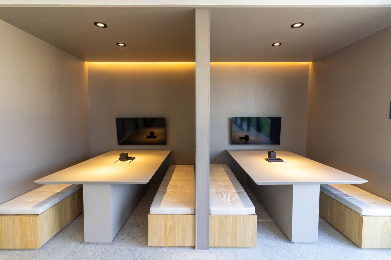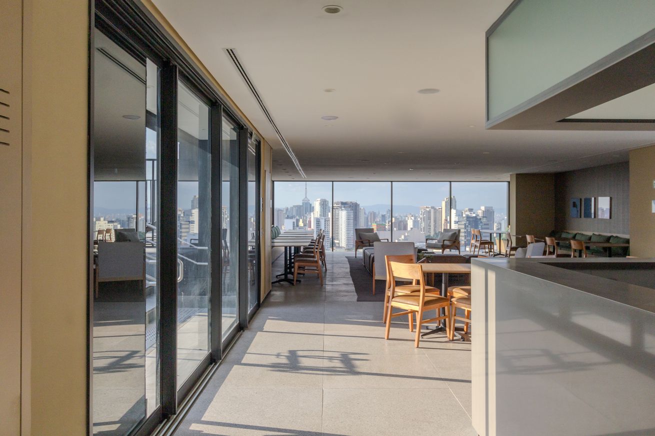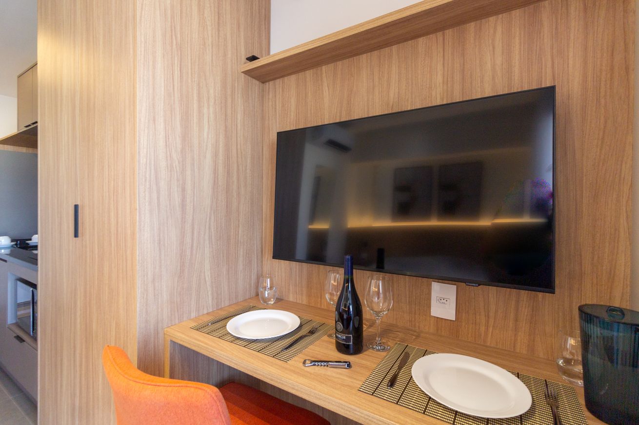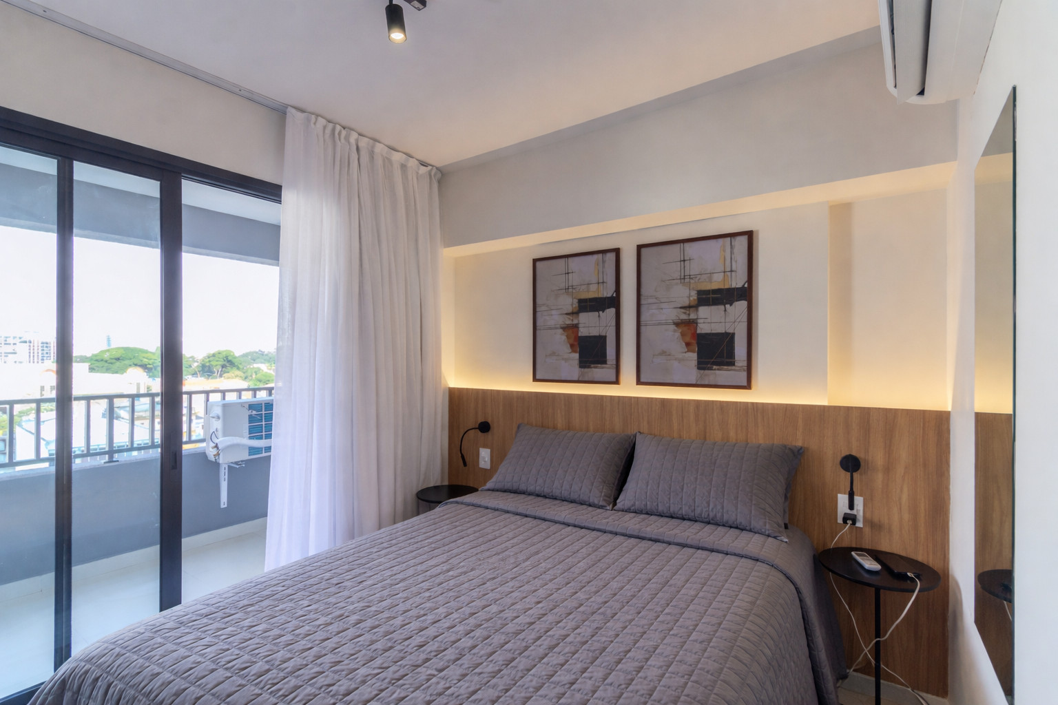 - Ambiente integrado com 1 cama de casal, ar-condicionado, smart TV, sofá, mesa multifuncional para refeições e trabalho; e varanda ampla